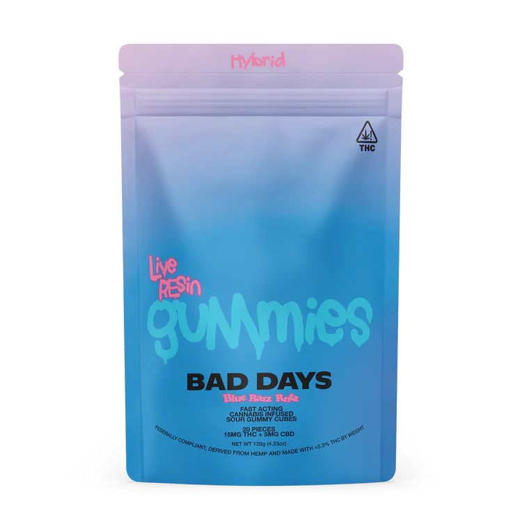 VEGAN FRIENDLY, BLUE RAZZ FLAVORED GUMMIES INFUSED WITH 15MG OF THC + 5MG OF CBD. BAD DAYS GUMMIES ARE DERIVED FROM HEMP AND MADE WITH <0.3% THC BY WEIGHT.